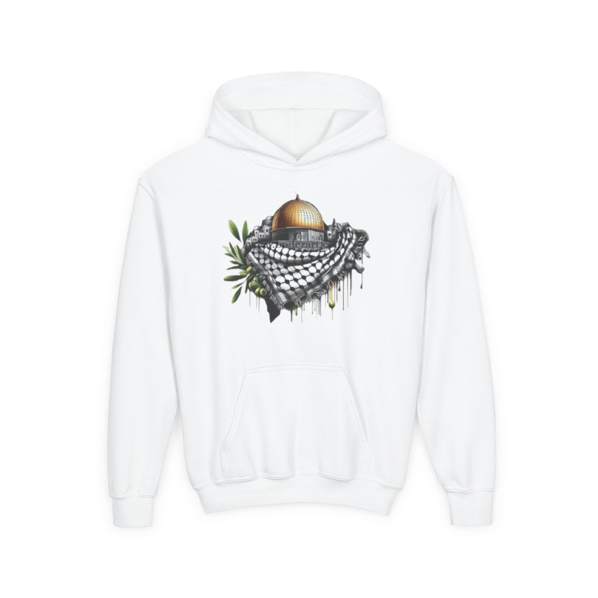 This hoodie carries a quiet, steadfast pulse — a soft white canvas wrapped around a detailed, symbolic print that speaks of home, memory, and resilience. The central artwork blends a keffiyeh pattern with an emblematic dome, rendered in muted blacks, golds, and olive tones with subtle paint-drip accents. It sits low on the chest, like a worn badge of belonging, and the roomy kangaroo pocket and medium-weight fabric make it a go-to layer when temperatures dip. Comfortable, durable, and thoughtfully finished with twill necktape and a sewn-in label, it moves from everyday errands to evening gatherings with ease. For kids and teens who carry cultural meaning in their wardrobe, this hoodie feels personal — familiar in texture, striking in imagery.