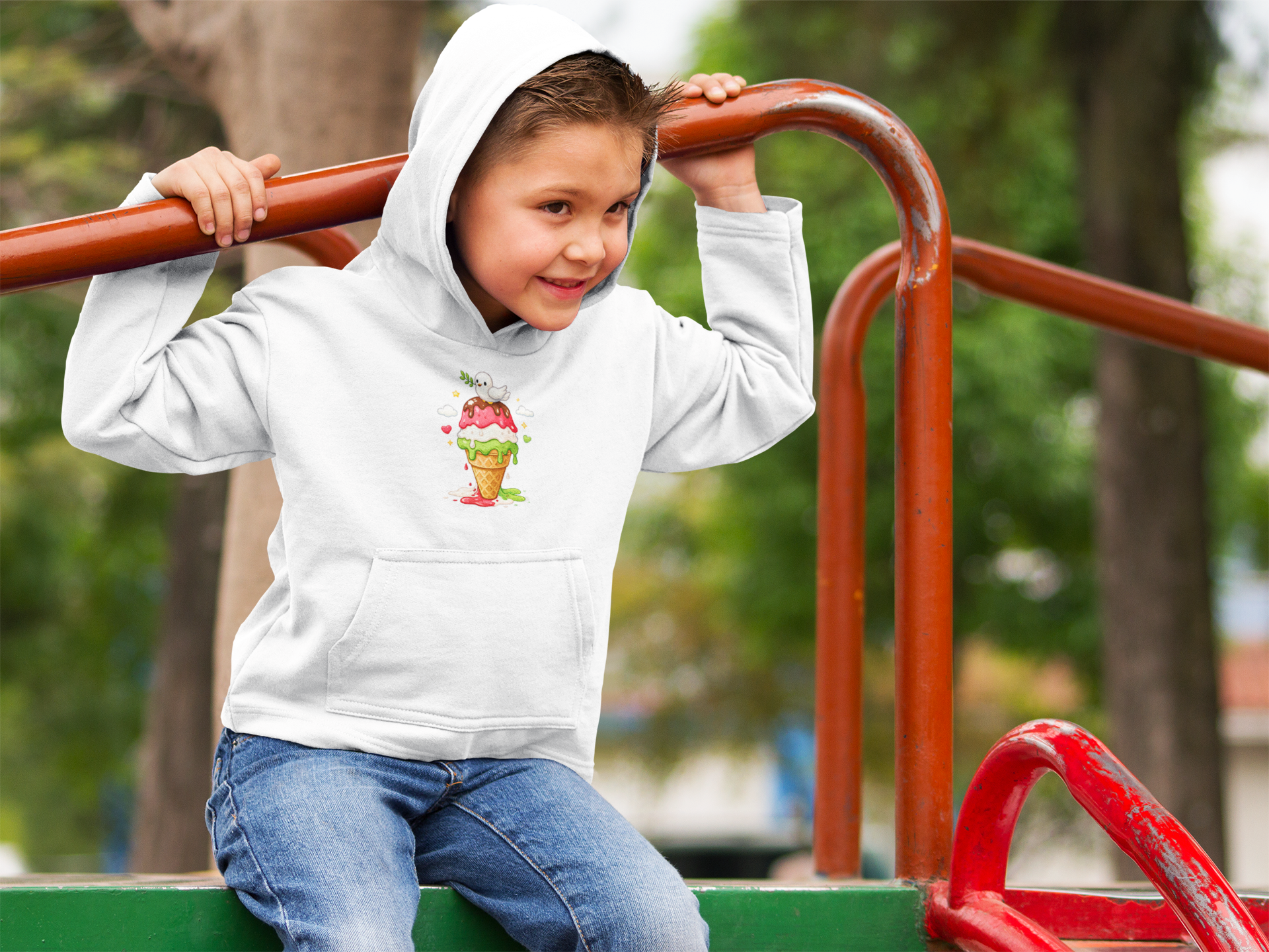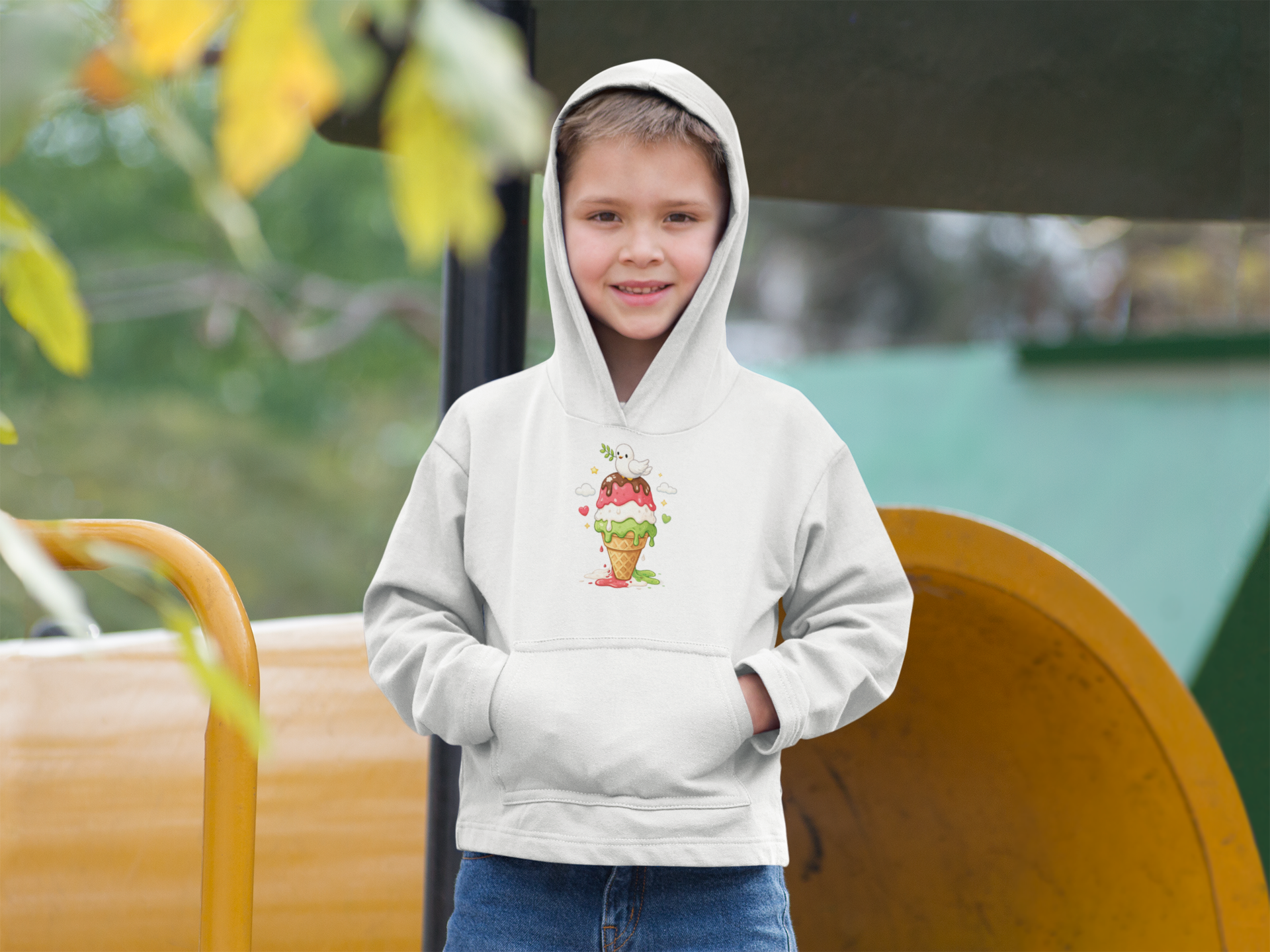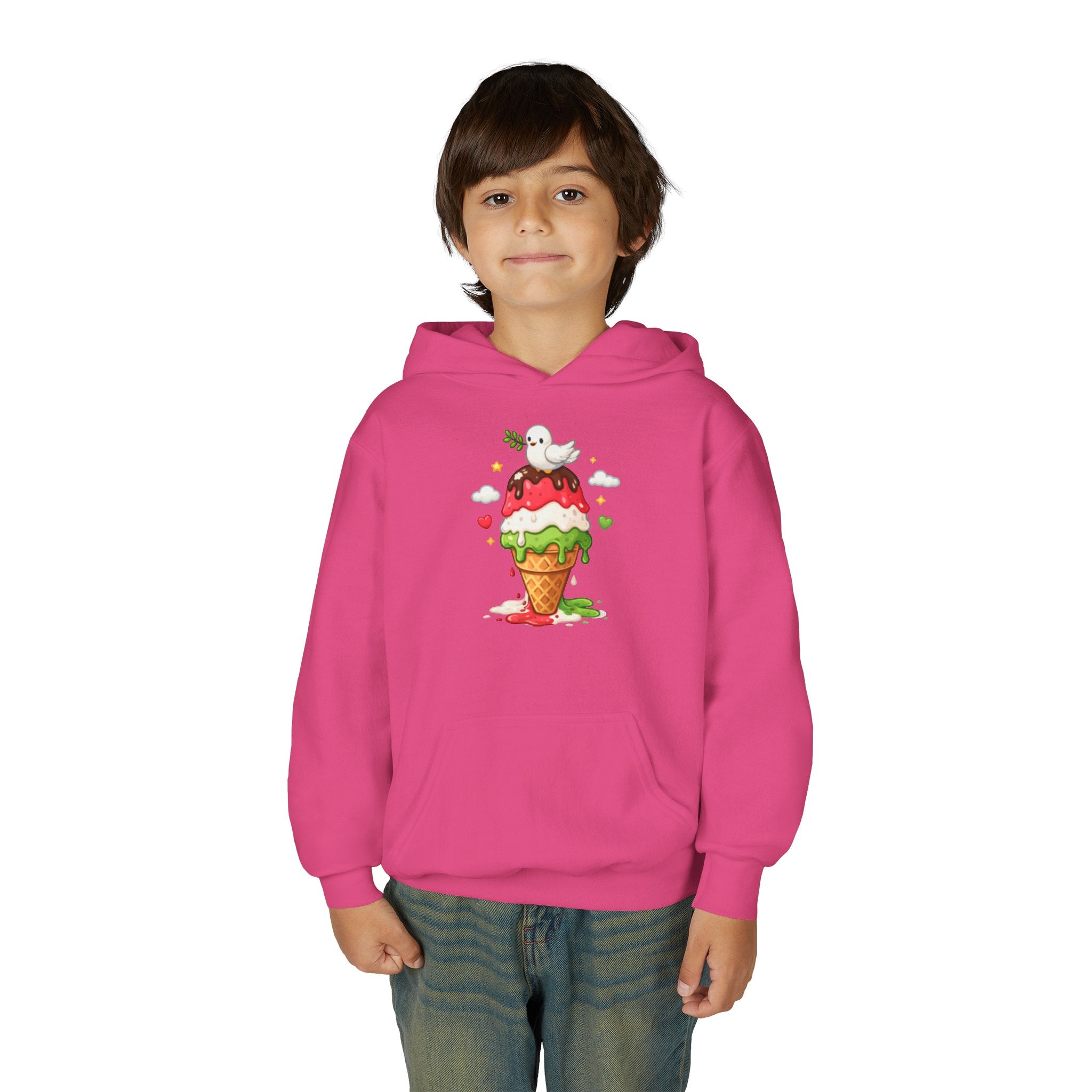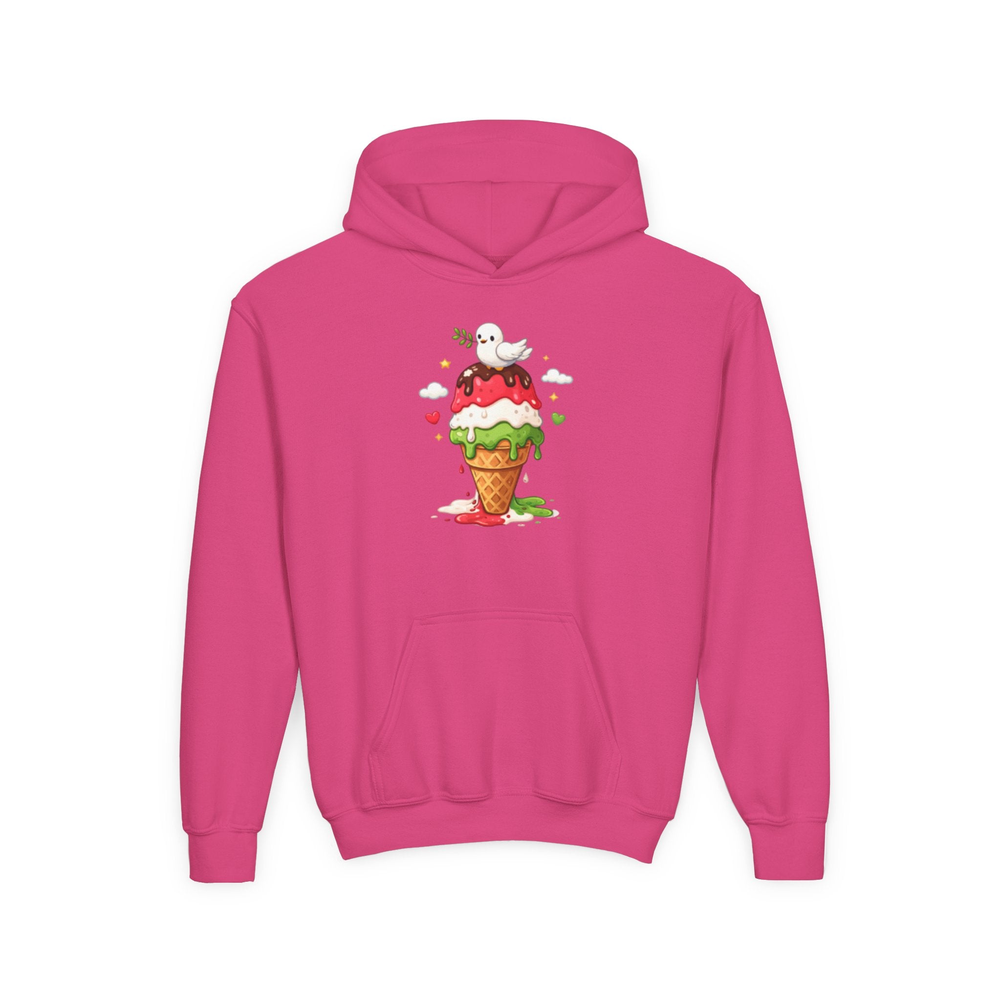 This cozy youth hoodie brings a playful, hand-painted vibe to chilly afternoons. A smiling ghost perches atop a melting, triple-scoop ice cream cone — bright strawberry, mint and vanilla tones bleed together like watercolor. Soft midweight fabric and a roomy kangaroo pocket make it the kind of sweatshirt a kid reaches for after school, at the ice cream stand, or during family park days. The artwork feels spontaneous and whimsical, adding a splash of color to plain winter layers while the durable construction and stabilized neck seam stand up to active wear.