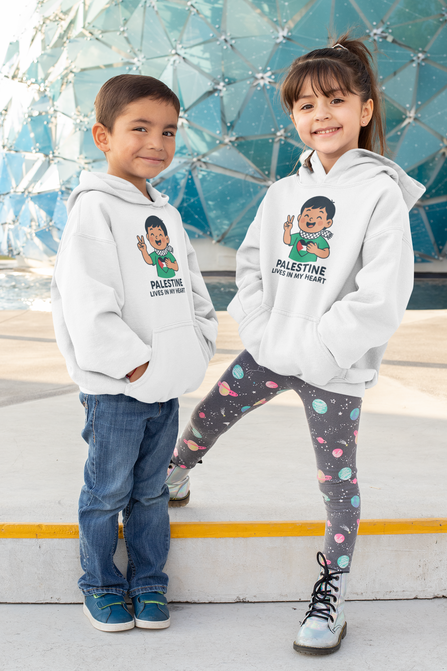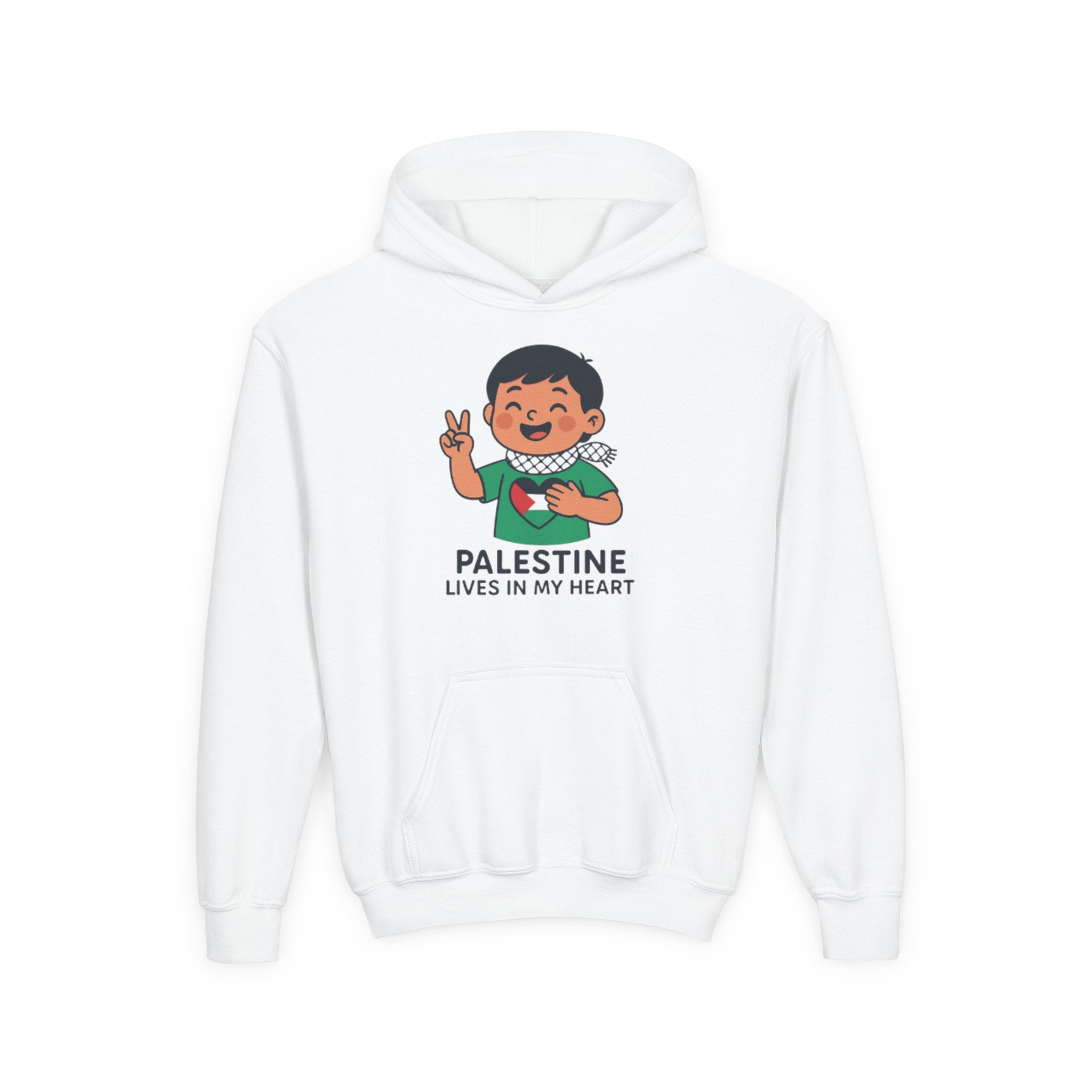 This youth hoodie brings a warm, hopeful voice to a child’s wardrobe. Soft midweight fabric shelters little hands in the roomy kangaroo pouch while a friendly illustration and the message “PALESTINE LIVES IN MY HEART” sit over the chest, gentle and proud. Designed to move with kids, the regular fit and sewn-in label keep things comfortable all day. Thoughtful construction — twill necktape to prevent stretching, durable blended fibers for long-lasting color and print, and options for embroidered accents — means this hoodie wears like a favorite from the first wash. It’s made with safety-compliant materials and crafted to the sizes kids already wear, so it slips on easily for school, rallies, family outings, or quiet moments at home.